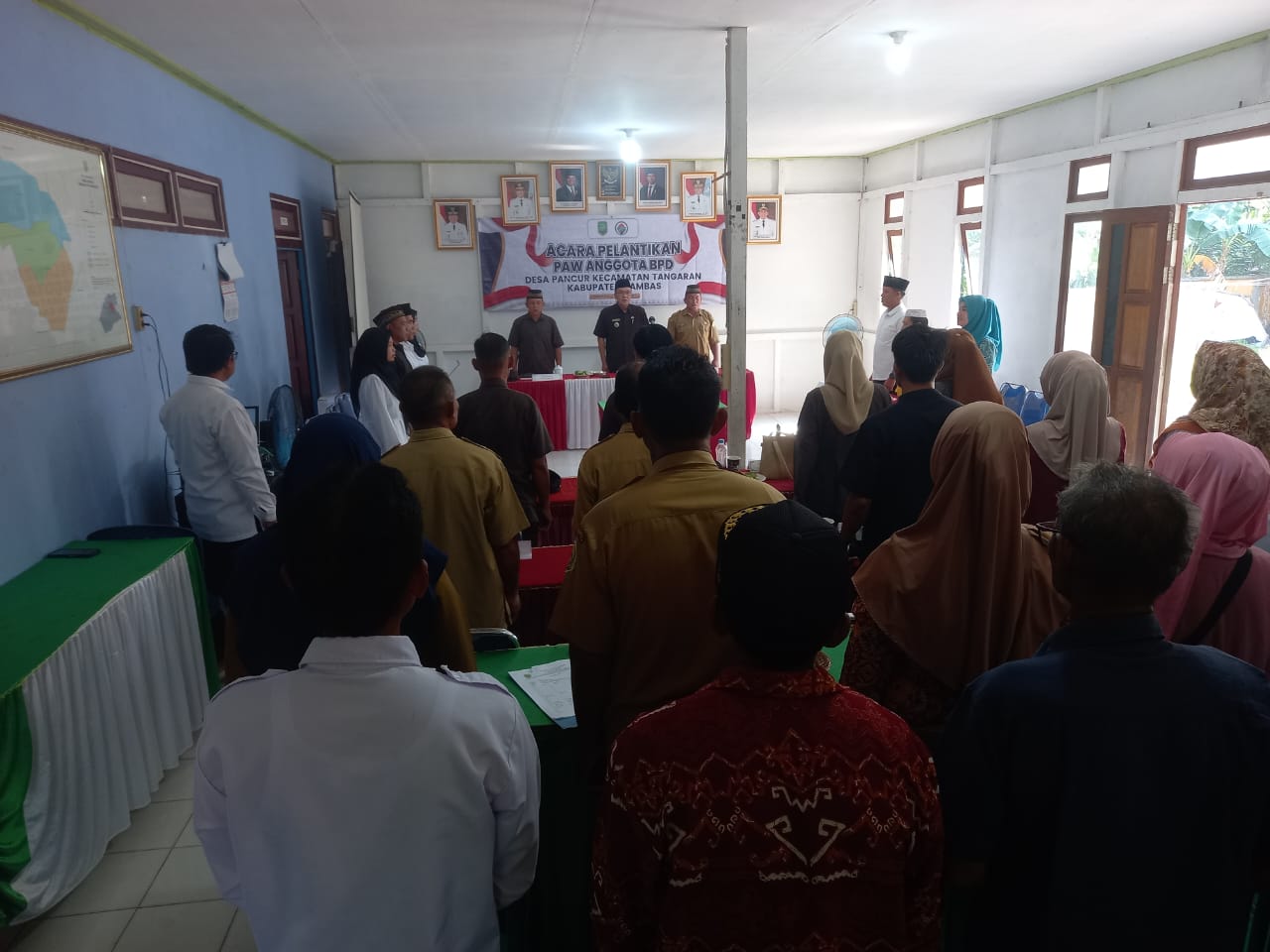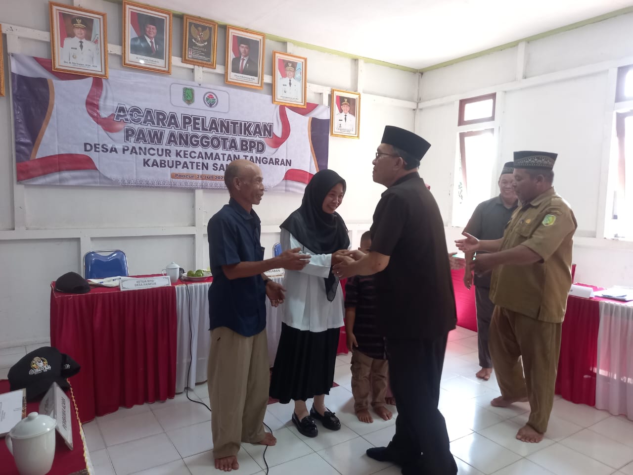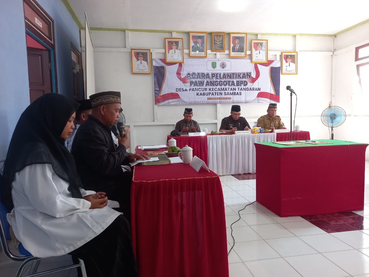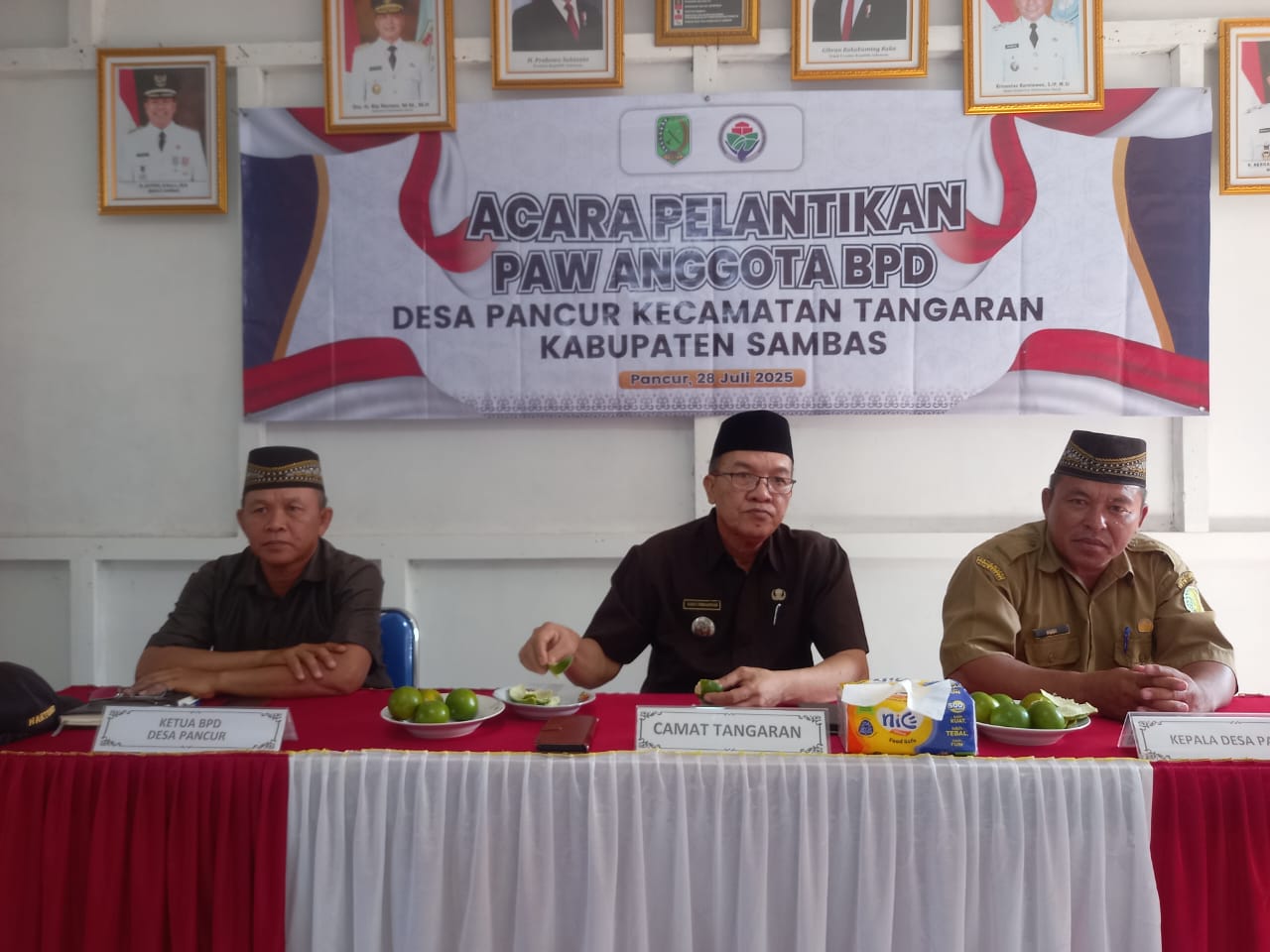 Pergantian antar waktu BPD Pancur Nuraini SPd menggantikan Haidil Putra Amd sesuai Keputusan Bupati Sambas Nomor 220/DPMD/2025 tanggal 10 Juni 2025. Prosesi pelantikan dan pengambilan sumpah janji PAW BPD digelar di Gedung Serbaguna Desa Pancur, Senin (28/7), dipimpin langsung oleh Camat Tangaran selaku perwakilan Bupati Sambas.